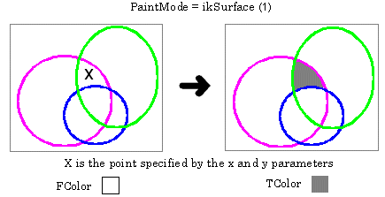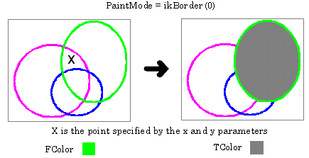 Starting from the coordinates specified by the x and y parameters, the IKPaint function uses the FColor as a boundary and fills the area inside (or outside) that boundary with the TColor.
